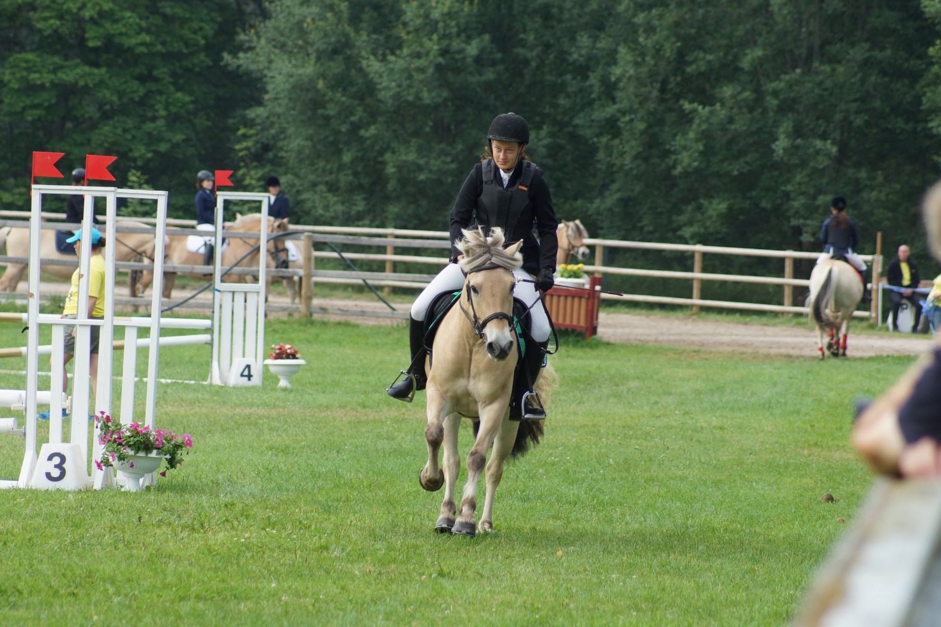 Här hopptränar Alve (e:Donit 155 u:Alvina 2934) på 80-85 cm, inför höstens tävlingar. Ryttare och ägare Hanna Jansson