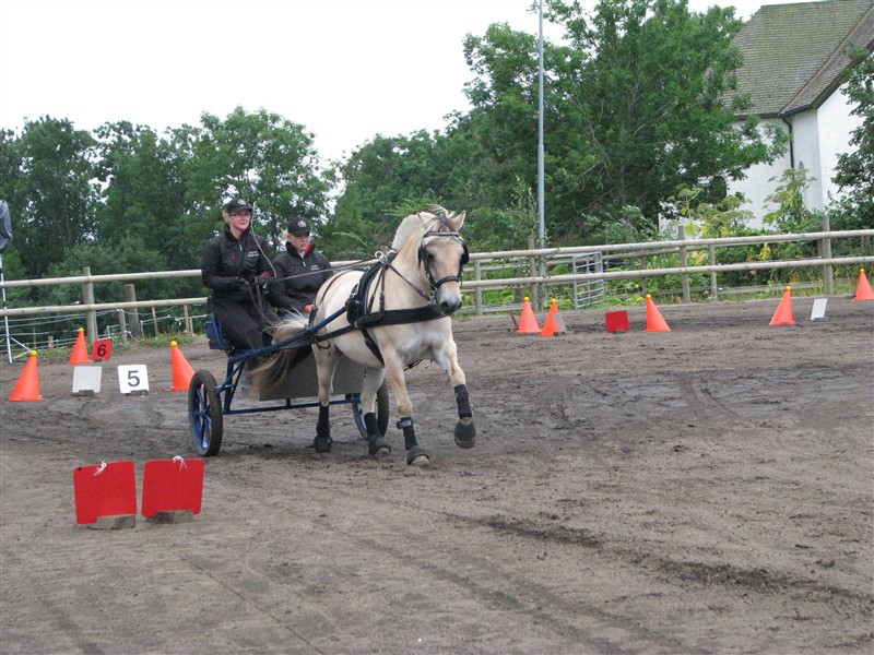 Jenny Karlsson och groomen Amanda Elofsson med Ruudslettas Linnea i precissionskörning på väg till första porten